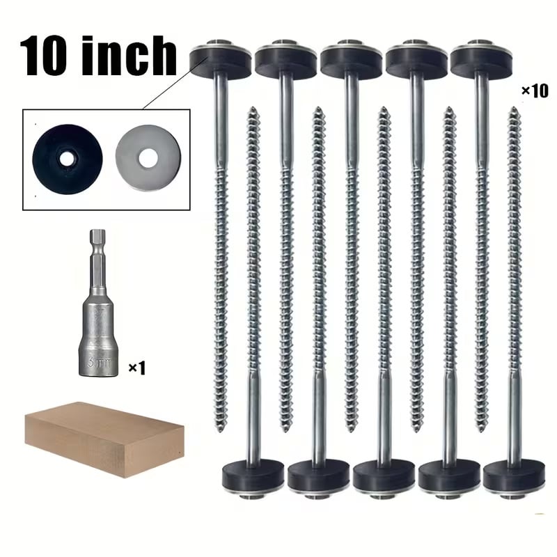 10x 250mm Flat Top Screw-In Ground Pegs + Adaptor | Heavy Duty Drill Tent Pegs Hex Stakes